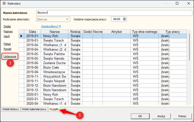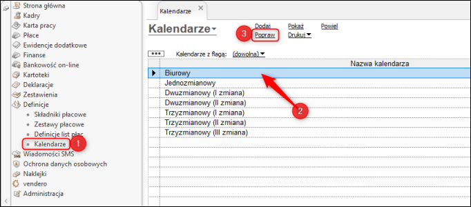 1. Otworzyć moduł Definicje – Kalendarze i Poprawić wybrany kalendarz.