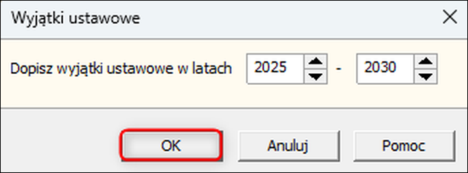 3. Ustalić zakres dat, w którym mają zostać dopisane odpowiednie wyjątki i zatwierdzić zmiany przyciskiem OK.