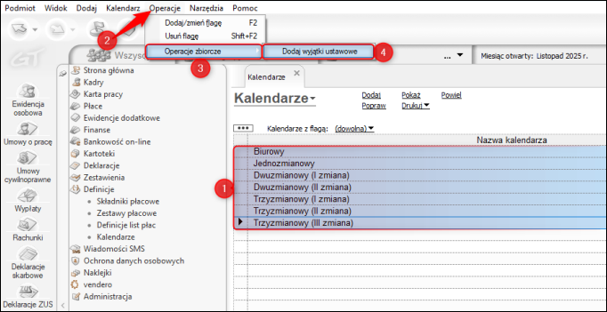 Istnieje także możliwość zbiorczego dodania wyjątków ustawowych. W tym celu należy zaznaczyć wybrane kalendarze, a następnie w górnym menu wybrać Operacje – Operacje zbiorcze – Dodaj wyjątki ustawowe.