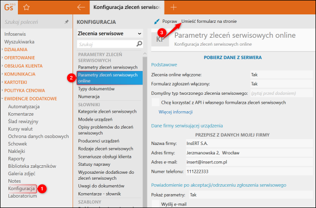 1. Przejść do modułu Konfiguracja – Parametry zleceń serwisowych online i skorzystać z opcji Umieść formularz na stronie znajdującej się w górnym menu.
