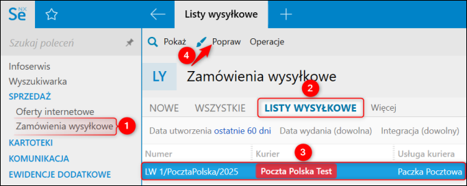 1. Przejść do modułu Sprzedaż – Zamówienia wysyłkowe do zakładki Listy wysyłkowe, wybrać pozycję na liście i kliknąć Popraw.