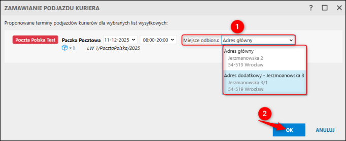 3. W polu Miejsce odbioru wskazać odpowiedni adres, uzupełnić resztę danych i potwierdzić operacje przyciskiem Ok.
