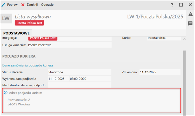 Adres odbioru będzie widoczny na Liście wysyłkowej w polu Adres podjazdu kuriera.