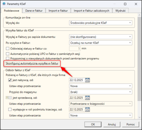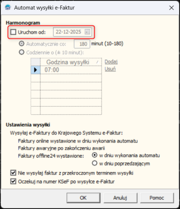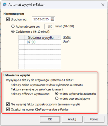 Nie wysyłaj faktur z przekroczonym terminem wysyłki – pole jest standardowo zakreślone i umożliwia pomijanie e-Faktur, dla których termin wysyłki został przekroczony, dając tym samym czas na zdecydowanie, co z nimi zrobić. Ustawienie to skutecznie pomija e-Faktury wystawione w trybieonline, których czas na wysyłkę jest opóźniony do maksymalnie jednego dnia roboczego – jest to zgodne z przepisami wchodzącymi w życie od 01.02.2026 r. Odznaczenie tego pola spowoduje, że automat nie będzie zwracał uwagi na to, czy termin wysyłki danego dokumentu został przekroczony czy nie, co może się w przyszłości wiązać z karami za niedotrzymanie terminów wysyłki.