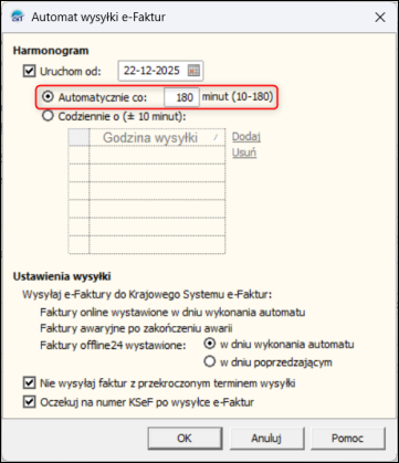Automatycznie co: (...) minut – pozwala na uruchamianie automatu w określonych odstępach czasu od uruchomienia programu na dowolnym stanowisku. Program będzie samodzielnie wybierał jedno z aktywnych stanowisk i uruchamiał proces wysyłki e-Faktur do KSeF.