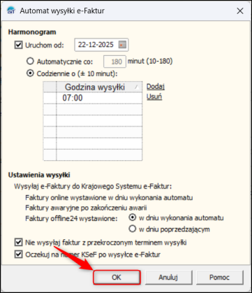 Faktury offline24 wystawione: w dniu wykonania automatu – ustawienie tego parametru będzie pozwalać automatowi na wysyłkę e-Faktur offline24, których data wystawienia jest taka sama jak data inicjalizacji wysyłki.