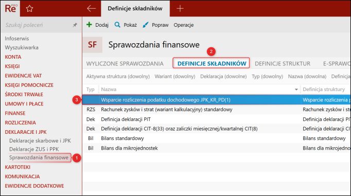 Program Rewizor nexo pozwala na naliczenie i przesłanie pliku JPK_KR_PD. W sytuacji, gdy na zakładce RPD (rozliczenie podatku dochodowego) pojawiają się zerowe wartości, konieczne jest zdefiniowanie struktury Wsparcie rozliczenia podatku dochodowego JPK_KR_PD(1). Można to zrobić z poziomu modułu Sprawozdania finansowe – Definicje składników.