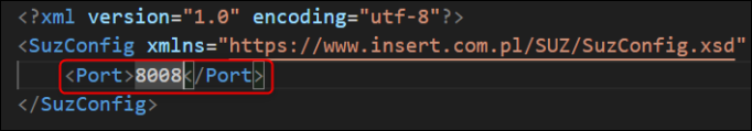 1. Otworzyć plik xml za pomocą dowolnego edytora tekstowego znajdujący się w lokalizacji C:\ProgramData\InsERT\SUZ\SuzConfig.xml, zmienić wartość elementu <Port> i zapisać plik.