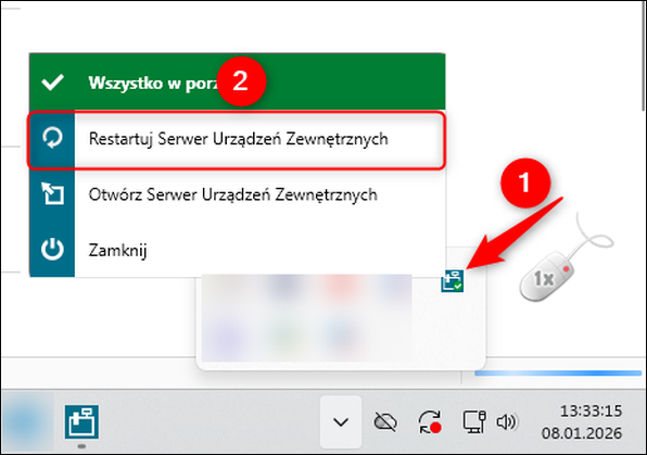 2. Kliknąć PPM ikonę SUZ znajdującą się w dolnym pasku systemu i wybrać opcję Restartuj Serwer Urządzeń Zewnętrznych.