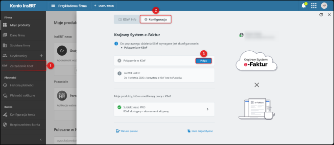 ​Konto InsERT pozwala na wskazanie certyfikatu i połączenie firmy z KSeF 2.0. Aby to zrobić, należy: