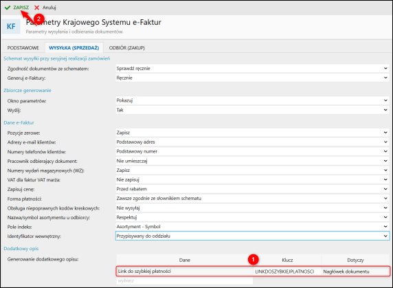 2. W polu Generowanie dodatkowego opisu: wskazać Link do szybiej płatności. Zatwierdzić zmiany klikając Zapisz.