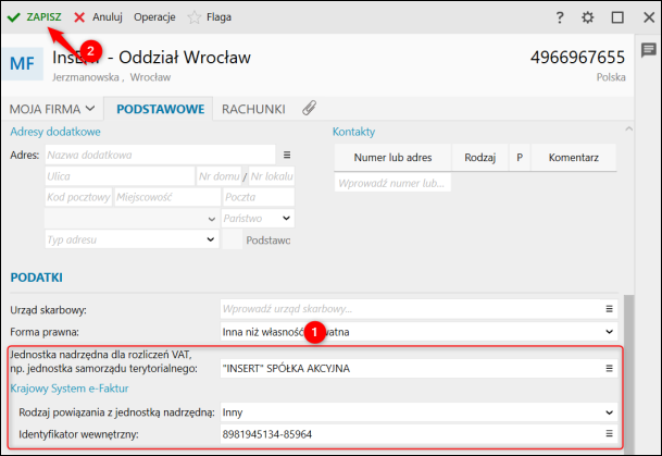 3. W sekcji Podatki uzupełnić pole Jednostka nadrzędna dla rozliczeń VAT wybierając centralę, określić Rodzaj powiązania z jednostką nadrzędną jako Inny, a w polu Identyfikator wewnętrzny wskazać odpowiednią wartość. Zatwierdzić zmiany klikając Zapisz.