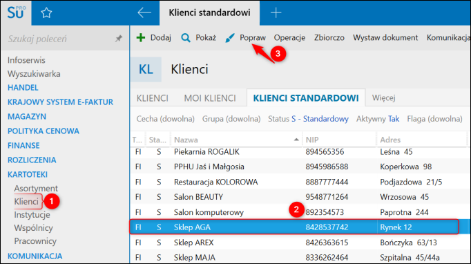 1. Przejść do modułu Kartoteki – Klienci, wybrać pozycję na liście i kliknąć Popraw.