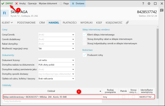 2. Wejść do zakładki Handel, a w sekcji Oddziały wskazać podmiot, który ma być wykazywany jako Podmiot3 na e-Fkaturze, określić Rodzaj powiązania jako Inny i uzupełnić Identyfikator wewnętrzny. Zatwierdzić zmiany klikając Zapisz.