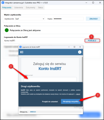 6. W sekcji Logowanie do Konta InsERT kliknąć Podłącz, zaakceptować politykę ciasteczek, a następnie zalogować się danymi do konta InsERT.