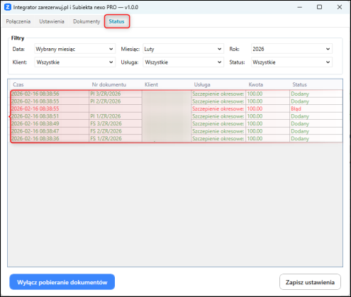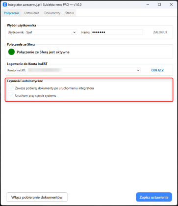Zawsze pobieraj dokumenty po uruchomieniu integratora – po każdym uruchomieniu integrator automatycznie sprawdzi dostępność nowych dokumentów i rozpocznie ich pobieranie bez konieczności ręcznego wywoływania tej operacji. Dokumenty będą cyklicznie weryfikowane i pobierane w interwałach co 1 minutę.