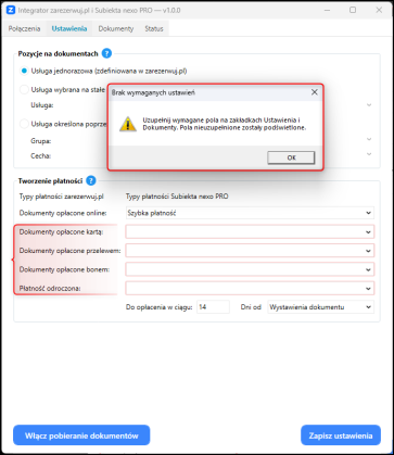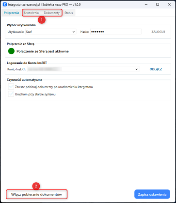 7. Skonfigurować Parametry dostępne na zakładkach Ustawienia i Dokumenty, a następnie Włączyć pobieranie dokumentów.