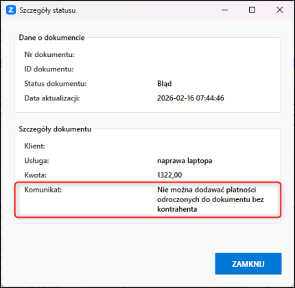W przypadku wystąpienia błędu można dwukrotnie kliknąć na pozycję, aby zobaczyć szczegóły Komunikatu.