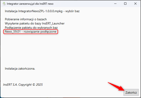 Po zakończeniu instalacji pojawi się komunikat o podłączeniu rozwiązania. Wybrać przycisk Zakończ.