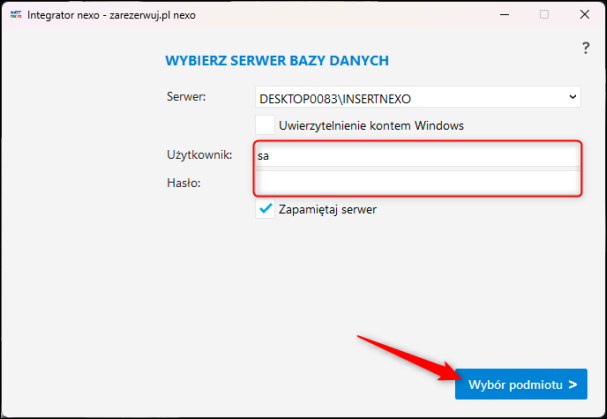 2. Przy pierwszej instalacji program wyświetli okno wyboru serwera. W polu Użytkownik wpisać sa, podać Hasło (jeśli zostało ustawione), a następnie kliknąć Wybór podmiotu.