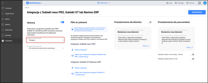 Uwaga! Integracja z Subiektem GT/nexo dostępna jest dla posiadaczy licencji zarezerwuj.pl demo (1-miesięczny okres próbny) oraz 12-miesięcznej.
