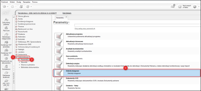1. Przejść do modułu Administracja – Parametry – Dekrety księgowe.