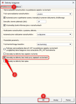 2. Na zakładce Podstawowe zaznaczyć opcję Zezwalaj na dekrety bez treści przy zapisach na kontach i zatwierdzić przyciskiem OK.