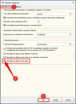 2. Na zakładce Podstawowe zaznaczyć opcję Zezwalaj na dekrety bez opisu i zatwierdzić przyciskiem OK.
