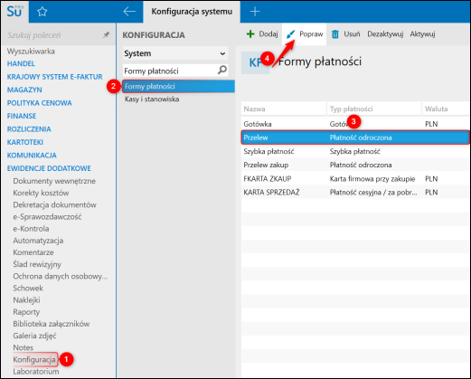 1. Przejść do modułu Konfiguracja – Formy płatności wybrać pozycję na liście i kliknąć Popraw lub dodać nową.