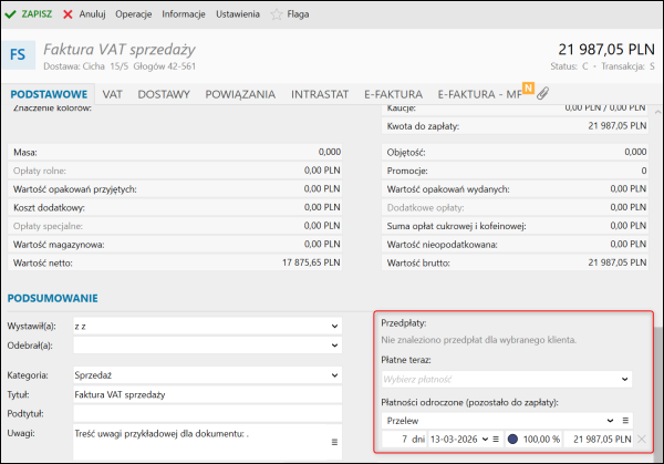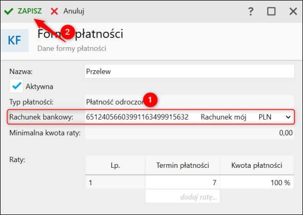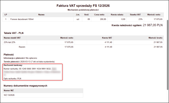Po wystawieniu faktury z wykorzystaniem tej formy płatności wskazany rachunek bankowy zostanie przesłany do KSeF oraz będzie prezentowany w podglądzie e-Faktury w odpowiednim miejscu.