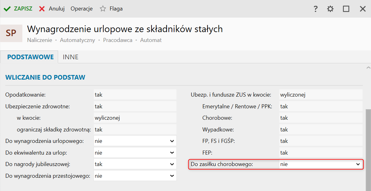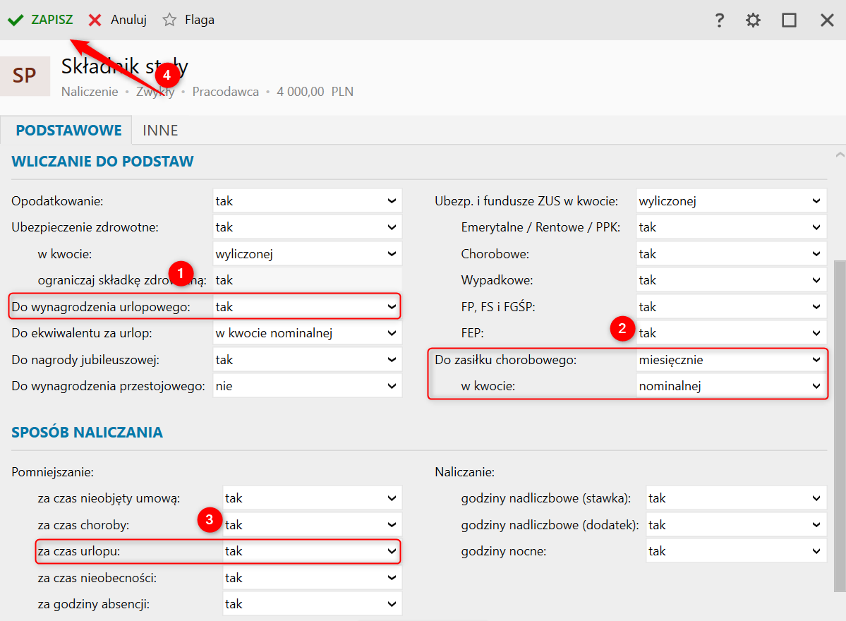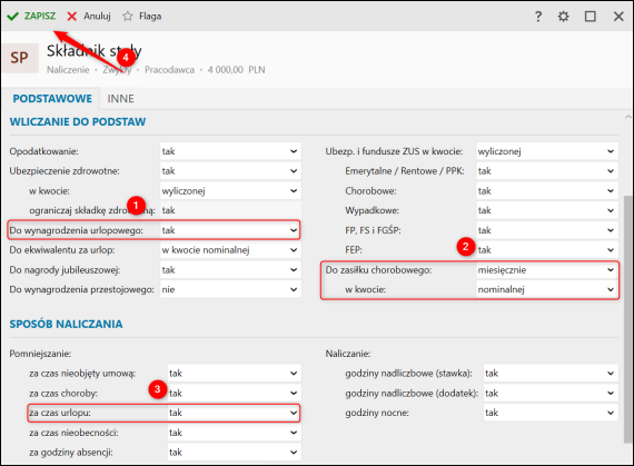 • Wliczanie do podstawy wynagrodzenia urlopowego – przestawić na TAK,