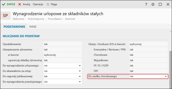 3. Upew​nić się, czy na skład​niku płacowym Wynagrodzenie urlopowe ze składników stałych​​​​, znacznik Do zasiłku chorobowego ustawiony jest na „nie”.