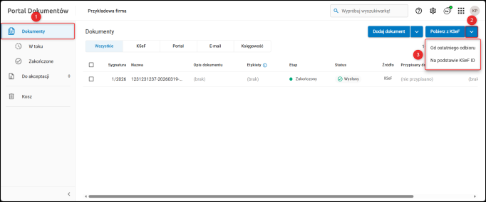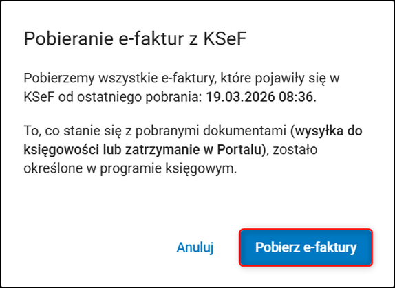 Portal Dokumentów umożliwia pobieranie e-Faktur z KSeF. W tym celu należy przejść do widoku Dokumenty, a następnie skorzystać z opcji dostępnych do rozwinięcia przy przycisku Pobierz z KSeF. Do wyboru udostępniono pobieranie:
