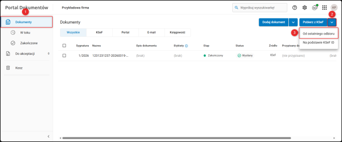 1. Przejść do widoku Dokumenty, rozwinąć opcje Pobierz z KSeF, a następnie wybrać Od ostatniego odbioru.