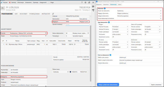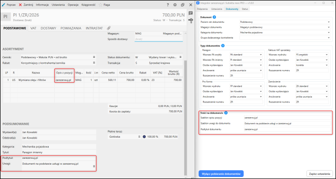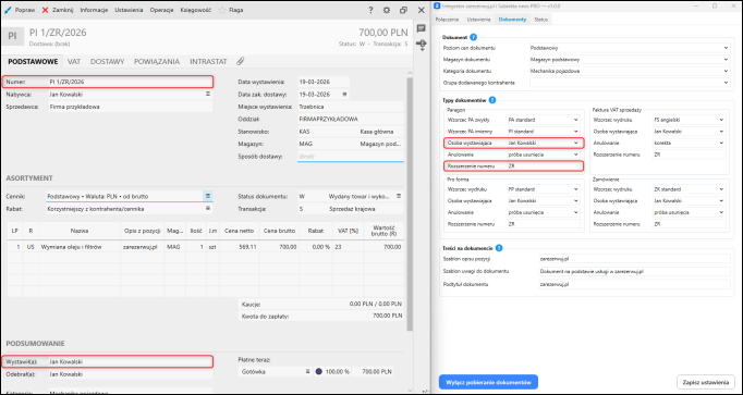 W przypadku Paragonu ustawiono rozszerzenie numeru dokumentu ZR oraz wskazano Jana Kowalskiego jako osobę wystawiającą dokumenty.