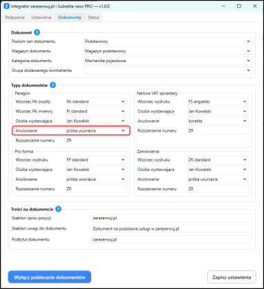 Domyślny typ dokumentu – Parametr określa, jaki dokument sprzedażowy zostanie automatycznie wygenerowany przez system w ramach integracji. Dostępne opcje do wyboru: Faktura, Zamówienie, Proforma, Paragon lub Wybierz dokument.