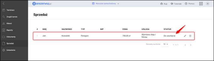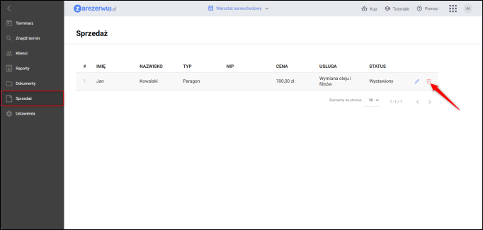W kolejnym kroku należy przejść w serwisie zarezerwuj.pl do modułu Sprzedaż, a następnie kliknąć ikonę kosza przy wybranym dokumencie.