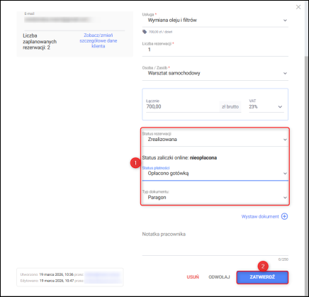 Należy zmienić status rezerwacji na Zrealizowana, aby wywołać wcześniej skonfigurowany warunek dotyczący wystawienia dokumentu. Na tym etapi​e należy również wybrać odpowiedni Sposób płatności, a następnie Zatwierdzić wprowadzone zmiany.​