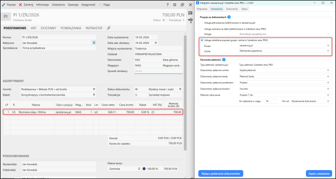 Dzięki temu mechanik lub pracownik warsztatu nie musi ręcznie tworzyć dokum​​entów – wszystkie informacje są synchronizowane automatycznie, a dokument w Subiekcie nexo PRO jest gotowy do weryfikacji, wydruku lub wysyłki do klienta.​