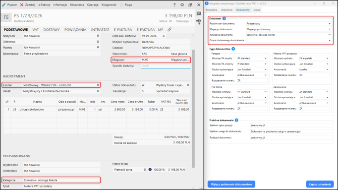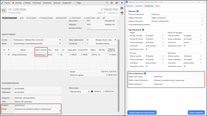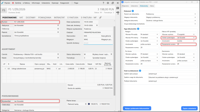 W przypadku Faktury sprzedaży ustawiono rozszerzenie numeru dokumentu ZR oraz wskazano Jana Kowalskiego jako osobę wystawiającą dokumenty.