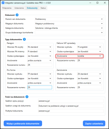 Jeżeli konieczne jest wystawienie korekty dokumentu, w konfiguracji Integratora należy ustawić parametr Anulowanie jako Korekta.