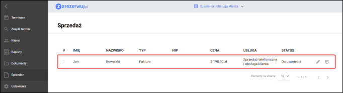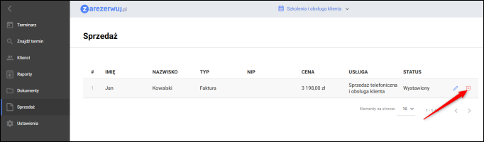 W kolejnym kroku należy przejść w serwisie zarezerwuj.pl do modułu Sprzedaż, a następnie kliknąć ikonę Kosza przy wybranym dokumencie.