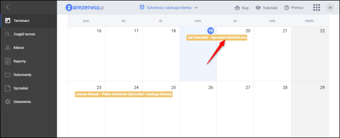 W tym przypadku określono, że ​dokument będzie wystawiany automatycznie po zmianie statusu płatności. Jako ​​​domyślny typ dokum​​entu wskazano Faktura.​ Przechodzimy na Terminarz i klikamy w wizytę którą chcemy zrealizować.