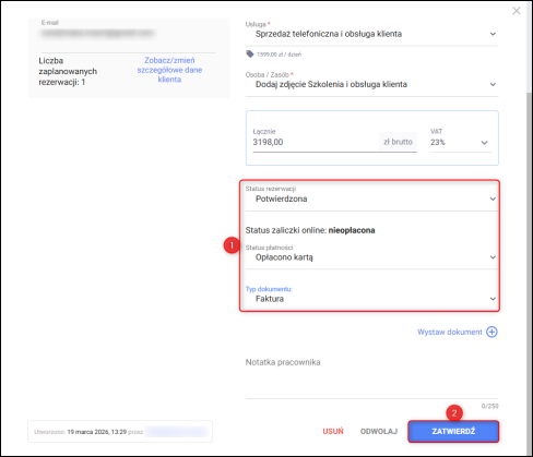 W kolejnym kroku konieczna jest zmiana Statusu płatności, aby wywołać wcześniej skonfigurowany warunek dotyczący wystawienia dokumentu. Na tym etapi​e można również wybrać odpowiedni Status rezerwacji. Zatwierdzić wprowadzone zmiany.​