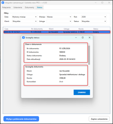 W Integratorze, na zakładce Status, dostępna jest informacja dotycząca poprawności pobrania dokumentu.