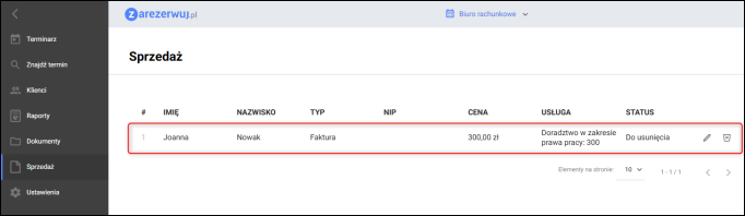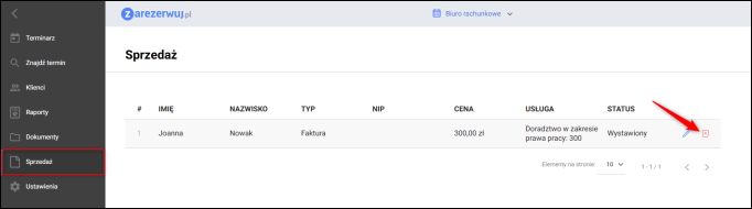 W kolejnym kroku należy przejść w serwisie zarezerwuj.pl do modułu Sprzedaż, a następnie kliknąć ikonę Kosza przy wybranym dokumencie.