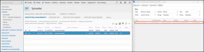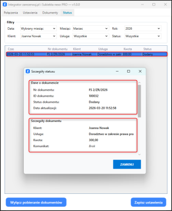 W Integratorze, na zakładce Status, dostępna jest informacja dotycząca poprawności pobrania dokumentu.