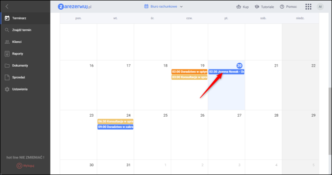 W tym przypadku określono, że dokument będzie wystawiany automatycznie po zmianie statusu rezerwacji na Zrealizowana. Jako domyślny typ dokumentu wskazano Faktura. Przechodzimy na Terminarz i klikamy w wizytę którą chcemy zrealizować.