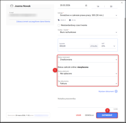 Zmiana statusu rezerwacji na zrealizowaną – dokument zostanie wystawiony dopiero po oznaczeniu rezerwacji jako zrealizowaną.