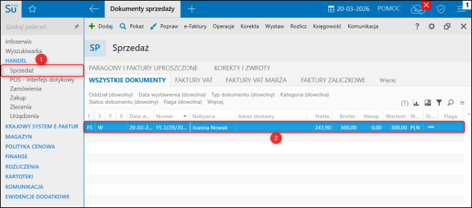 Wystawioną Faktura sprzedaży w programie Subiekt nexo PRO można podejrzeć w module Sprzedaż.